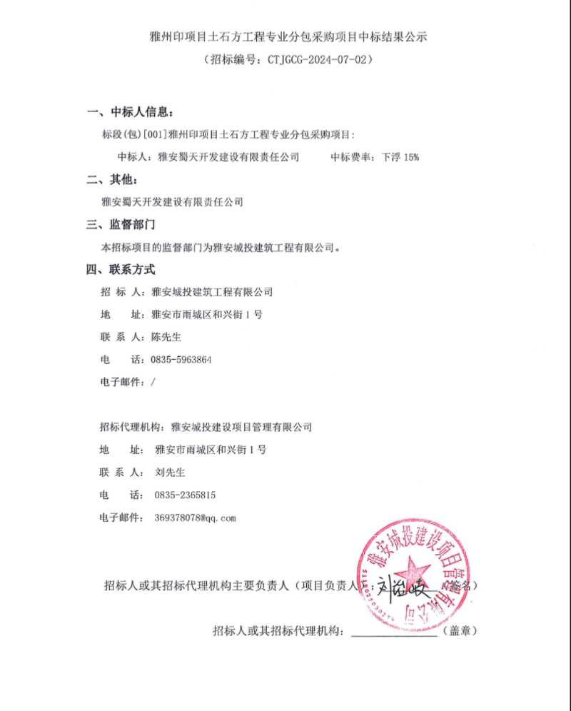 雅州印項目土石方工程專業(yè)分包采購項目中標結(jié)果公示