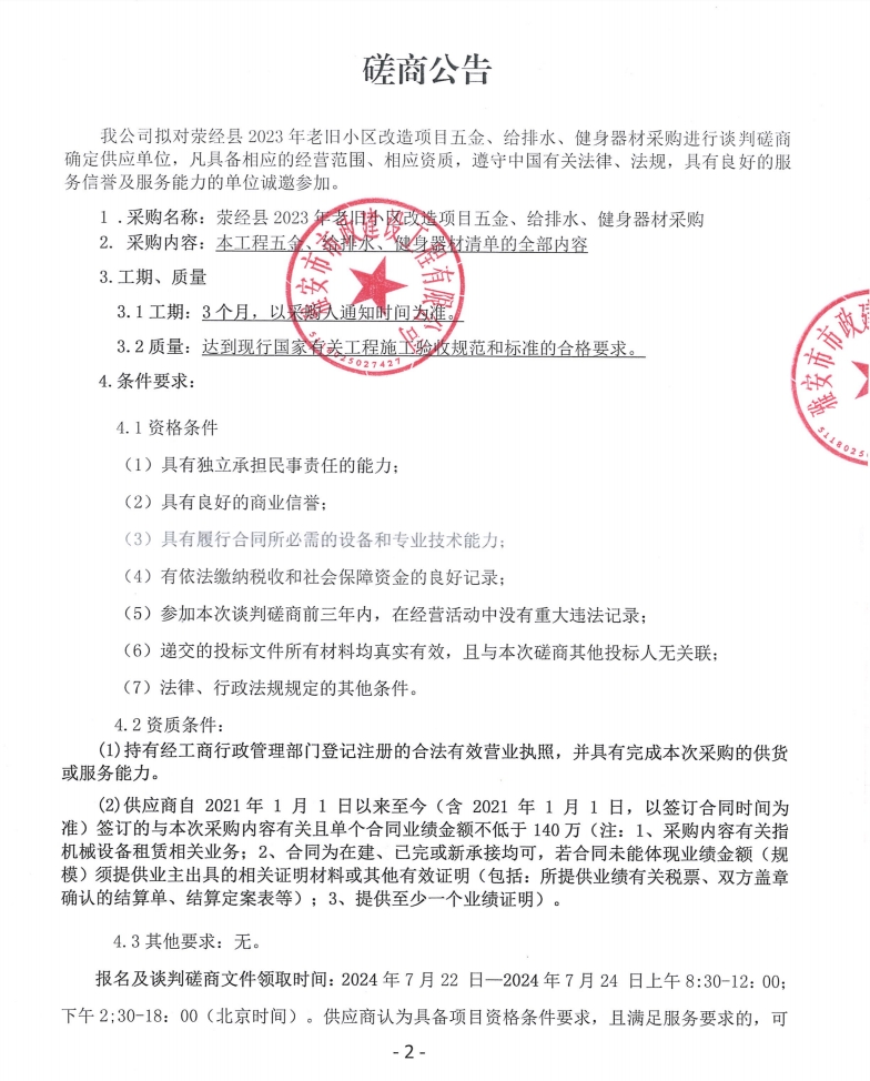 滎經(jīng)縣2023年老舊小區(qū)改造項(xiàng)目五金、給排水、健身器材采購磋商公告
