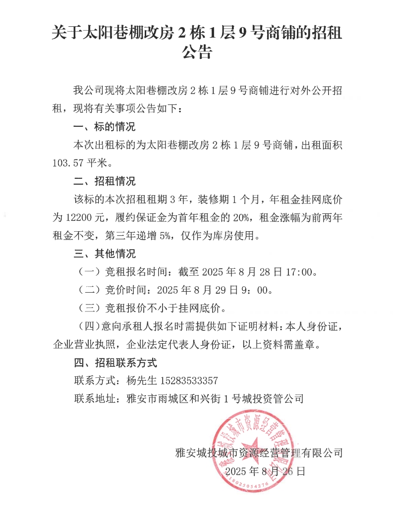 關(guān)于太陽(yáng)巷棚改房2棟1層9號(hào)商鋪的招租公告